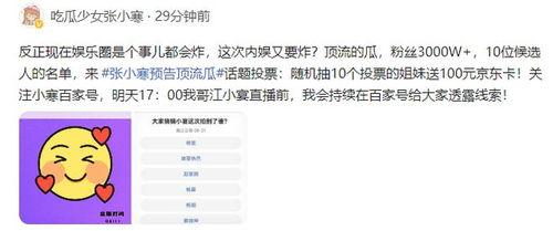 最近娱乐圈可是热闹非凡呢!张小寒这位知名博主又来了一次大爆料,这次的顶流瓜可是让人眼睛一亮,嘴巴都合不拢。咱们就一起来聊聊这个话题,看看张小寒这次都爆了些什么料吧!