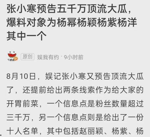 最近娱乐圈可是热闹非凡呢!张小寒这位知名博主又来了一次大爆料,这次的顶流瓜可是让人眼睛一亮,嘴巴都合不拢。咱们就一起来聊聊这个话题,看看张小寒这次都爆了些什么料吧!